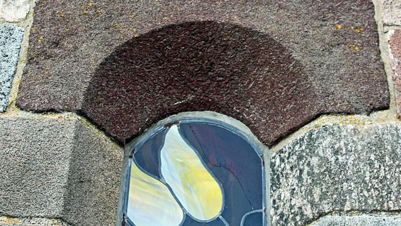 Fousing Church was built in the Norman style to which a Gothic style porch and tower were added in about 1500 and 1550 respectively. The church was built in two phases. The first phase, consisting of the chancel and the first 3 m section of the nave, was built using ashlar stones, whereas during the second phase ashlar stones were only used for the south wall and raw fieldstones for the north wall. The only remaining original windows on the east and north walls were bricked up, but that on the north wall was reopened in 2005 and is now occupied by a glass mosaic.